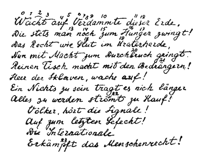 — Дозвольте, але ж він повинен був не тільки вибрати рядок, але й шифрувати своє повідомлення, виходить, скласти цю саму азбуку за текстом «Інтернаціоналу»?
