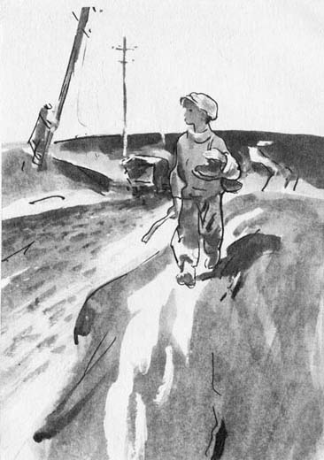 — А здорово висадили! Мабуть, тижнів на два спиниться рух на дільниці. От що, синку, нема чого тобі тут даремно сидіти, йди на дорогу, може, хто в машину візьме. Ти малий, тебе пожаліють.