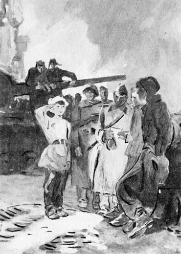 Тоді я сказав, що я Сашко Жук, що я хоч і не партизан, а допомагав партизанам, і що мене знає дядько Михайло і навіть сам Бородатий, і що Бородатий подарував мені оцього годинника за хоробрість (тут я показав годинник), і що я маю право вступати до Києва, бо я теж боровся проти фашистів, і що викрив гестапівську шпигунку, яка продавала партизанів гестапівцям, і що я врятував радянського офіцера Старикова, і багато всяких справ робив я, щоб дошкуляти фашистам, і нехай мене товариш офіцер не зсаджує з танка, бо я навіть перед парадами колись чіплявся до танків і дуже хочу вступати в Київ… І я продовжував швидко і гаряче говорити, а лейтенант обірвав мене й сказав, щоб я не забалакував йому зуби, а злізав з танка. Тоді я почав говорити таким жалісливим голосом, що мене ніяк не можна було зсаджувати з танка, і лейтенант сказав: «Ну гаразд, сиди, тільки міцніше тримайся, бо гепнешся під танк», а я сказав, що не гепнуся, бо я ще раніш, до війни, завжди чіплявся до машини і ніколи не гепався, а одного разу почепився до вантажної машини ззаду однією рукою й провисів отак од нашої вулиці аж до самого… Але лейтенант сказав, щоб я припинив красномовство, бо в нього починає боліти голова од моєї промови, хоч я ніякої промови й не виголошував, і він пересадив мене на танку попереду всіх і сказав: «Ну гаразд, будемо разом вступати до Києва…»
