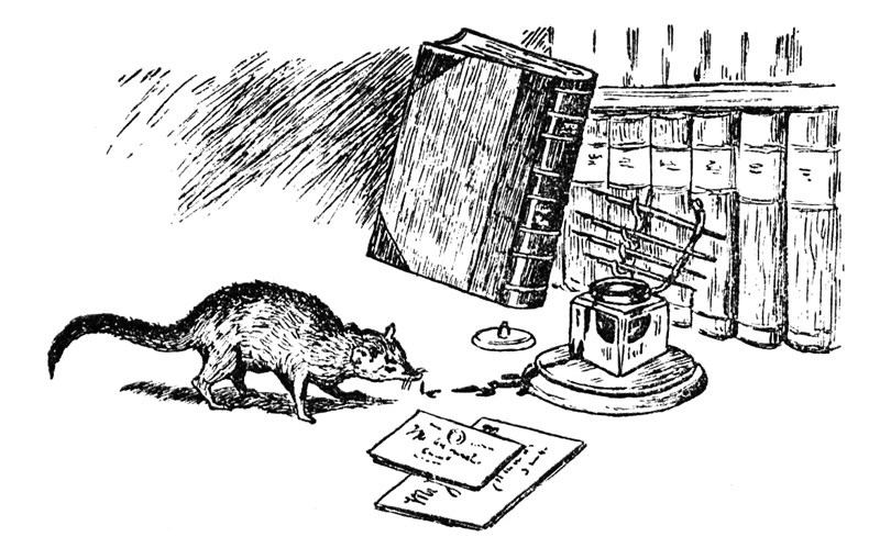 Rikki-Tikki vaatas poisi kaela ning kaeluse vahele, nuusutas tema k~orva ja ronis siis p~orandale, kuhu j"ai istuma, h~o~orudes oma nina.