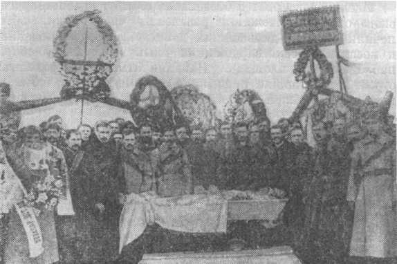 Похороны Г. И. Чапаева — первого военного комиссара г. Балакова, зверски убитого во время белогвардейско-эсеровского восстания 4 марта 1918 г. В первом ряду, в центре — отец погибшего; слева от него — В. И. Чапаев; левее его М. И. Чапаев; далее с перевязанной головой, — председатель союза металлистов г. Балакова поляк В. И. Сечко, раненный во время восстания; крайний справа — С. П. Захаров.