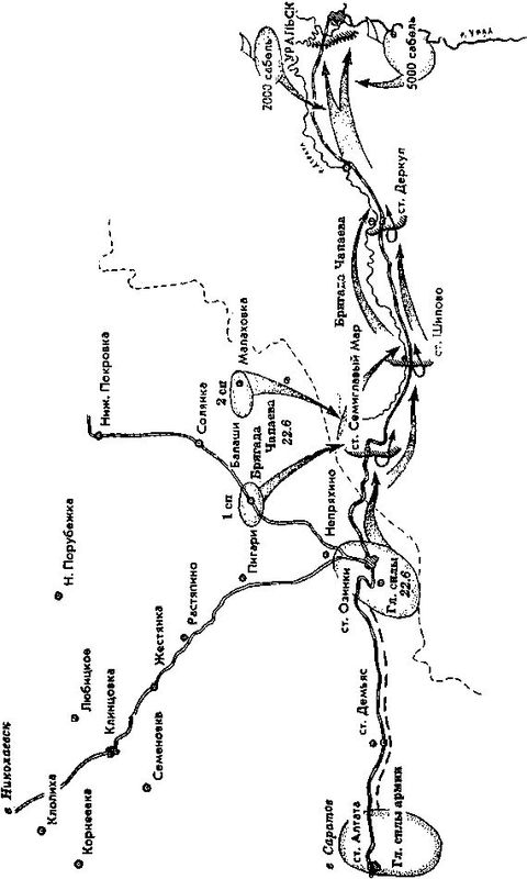 В результате мятежа белочехов и активизации уральских казаков нависла угроза над Новоузенском и Николаевском. 18 июня командование армии объявило уезды на осадном положении [249] , но продолжало заниматься восстановлением железной дороги. Наконец, 21 июня командарм отдал приказ Николаевским полкам овладеть станцией Семиглавый Мар [250] . С исходного положения части выступили каждая своим маршрутом, которые сходились по мере приближения к Семиглавому Мару. С утра 22 июня противник силою до 16 сотен встретил наступавших в районе хутора Коровин и первым пошел в атаку. Однако концентрическими ударами полков и огнем артиллерии казакам был нанесен большой урон. Только высокая маневренность их войска и пересеченность местности спасли их от полного уничтожения. В этот же день Семиглавый Мар был взят. Железная дорога от границы с Уральской областью до Семиглавого Мара оказалась разрушенной [251] .