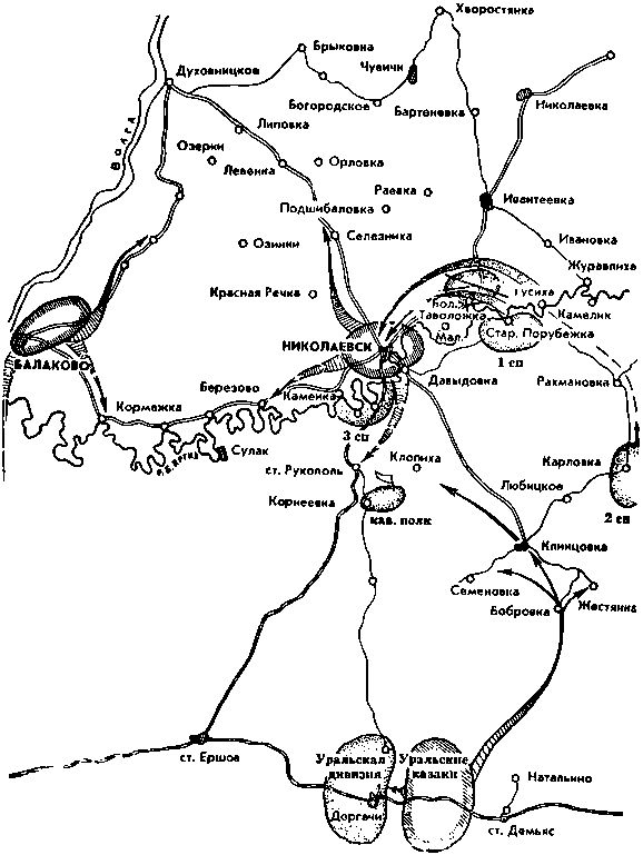 Чапаев же, когда над Николаевском нависла неотвратимая угроза его падения, а командование проявило растерянность, решил взять на себя управление бригадой и действовать по своему усмотрению [294] . Стремительно помчался он в Старую Порубежку, в 1-й Николаевский полк, одновременно послал гонца в Рахмановку с приказанием 2-му полку срочно следовать на село Гусиха. В Порубежке 1-й полк вел бой с наседавшим противником, овладевшим уже мостом через Иргиз и захватившим плацдарм на левом берегу реки. Весть о прибытии Чапаева быстро облетела бойцов. Командир полка И. М. Плясунков доложил о положении полка и о том, что начдив приказал отводить его к Давыдовне для совместных действий со 2-м полком.