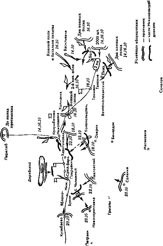 А положение было поистине отчаянное. В этот же день, 16 октября, при перемещении штаба дивизии из Нижней Покровки в Холманку пришлось выбивать противника, в том числе и силами штаба, из Холманки и Ишимбаева, захваченных им в тылу наших частей. Выбитый противник отходил в северо-восточном направлении к хутору Дмитриевский. Кавалерийский полк, отрезая путь отступления противнику, столкнулся с конным полком оренбургских казаков и батальоном пехоты с артиллерийской батареей, двигавшимися от хутора Дмитриевский на хутор Канаевский. Слабый и не имевший необходимой выучки полк имени Гарибальди не выдержал удара двух конных полков и батальона пехоты противника и потерпел серьезное поражение. Во встречном бою казаки зарубили 30 человек, захватили 2 орудия, 2 пулемета и обоз полка. К месту боя прибыл Василий Иванович с учебной командой, в которой он с начала формирования Николаевской дивизии готовил младших командиров. Кавалерийский полк был им остановлен, спешен (в конном строю он действовал слабее) и повернут в контратаку. Противника удалось отбросить, но захваченные им орудия, пулеметы и обоз со снарядами и продовольствием не отбили. Вслед за этим с восточной стороны два конных полка казаков атаковали Балашовский полк, который ошибочно принял их вначале за своих. Это позволило казакам ворваться в ряды балашовцев и зарубить до 200 человек. Положение в полку стало ужасным. В схватке помощник командира полка П. И. Касьяненко лично убил 10 казаков и от удара пики погиб сам. Погибли командир 1-й роты А. Марчук, его помощник А. Камышанский, командир 5-й роты К. Сурков и его помощник Ф. Жемчугов и многие другие отважные воины.