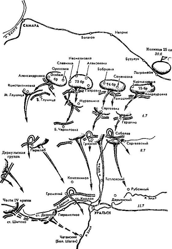 Группе В. И. Чапаева, в которую, кроме 25-й дивизии, входила Особая бригада под командованием И. М. Плясункова в составе 210-го имени Ленина и Рязанского стрелковых полков, 10-го кавалерийского полка, гаубичного дивизиона и легкой пушечной батареи, приказывалось сосредоточиться в районах: Особой бригаде — Александровна, Ивановка, Ореховка; 73-й бригаде 25-й дивизии — Славянка, Михайловна, Патровка, Алексеевка, Несмеяновка; 74-й бригаде — Сергеевна (Бобровка), Семеновна, Ромашкино; 75-й бригаде — Кандауровка, Курманаевка, Петровка (схема 16).