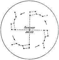 Полярная звезда для простого глаза кажется стоящей всегда на одном месте, почти точно на севере, а остальные звезды описывают вокруг нее (на самом деле — вокруг полюса мира) круги разной величины, смотря по расстоянию от полюса (рис. 3).