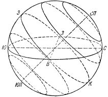 Рис. 4. Суточное движение светил в северном полушарии Земли. СП — северный полюс мира; ЮП — южный полюс мира; круг СВЮЗ — горизонт с четырьмя странами света.