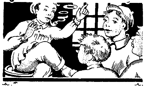 Джо с мрачным лицом на высокой бочке. Сосредоточенно сосал трубку (не вкусно, но нужно)… Тайная сходка — темный переулок центрального рынка — уютно и тихо. Напротив с горящими пылко глазами, на ящиках, в два этажа разместились: «Красный Кэб», «Гроза Бродвея», «Дик-Прыгун» и «Джим-Соколиные глаза».