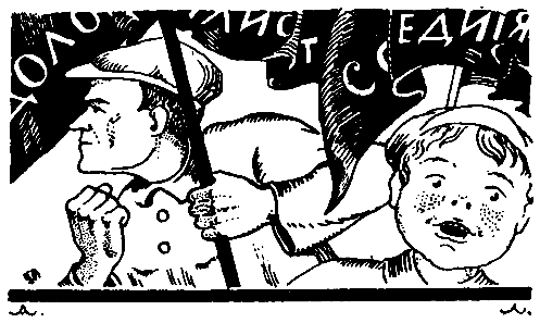 Шум разбивался у груды наваленных тачек — на них: красные флаги и Никельс — у ног приютился Джо (рот раскрыт, а глазенки-звезды).
