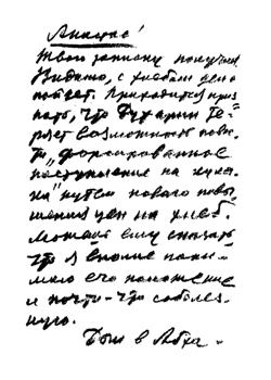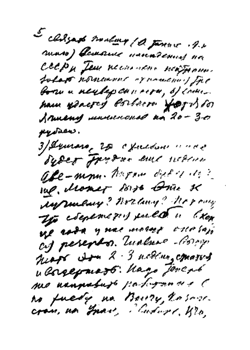 1) На счет Ай-Ви-ли ничего не могу сказать. Лично я против свидания. Не знаю как думает об этом Н.(?)Б. Но отказать прямо сейчас, пожалуй, невыгодно. Лучше всего будет, если напишешь ему, что я нахожусь вне Москвы и нужно прежде всего списаться со мной, чтобы можно было сообщить ему (Айвили) мое согласие или несогласие.