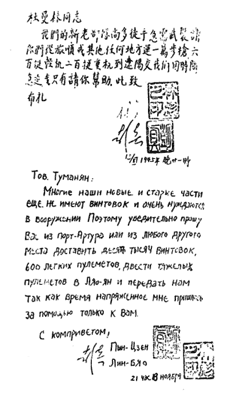 «Товарищ Туманян! Многие наши новые и старые части еще не имеют винтовок и очень нуждаются в вооружении. Поэтому убедительно прошу Вас из Порт-Артура или из любого другого места доставить десять тысяч винтовок, 600 легких пулеметов, двести тяжелых пулеметов в Ляо-Ян и передать нам. Так как время напряженное, мне пришлось за помощью обращаться только к вам.