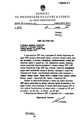 Комитет по физической культуре я спорту при Совете Министров СССР просит разрешения на выплату денежных премий футболистам и тренерам сборных команд-призеров VII летней Спартакиады народов СССР за счет средств Спорткомитета: за первое место - в размере до 500 руб., за второе - до 300 руб, , за третье - до 200 руб.