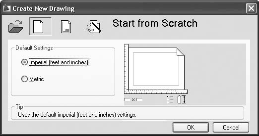 – Вторая кнопка – Start from Scratch (Простейший шаблон) (нажата на рис. 1.28). С ее помощью создается чертеж, не отличающийся от чертежа, созданного первым способом (без использования окна начала работы) без выбора шаблона.