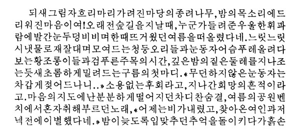 Пальмовое дерево, смутно вырисовывающееся во дворе в виде тени зяблика. Эй, душа, тянущаяся всей длиной к голосу ночи! Давным-давно кто-то шел по лесной тропинке и, слушая печальный свист, гладил свои красные брови, вспоминая далекое жаркое лето. В водах медленно текущего ручья, треща, собираются кряквы и пустельги и смотрят вверх мутным взглядом. Темно-синее внимательное время обходит темный круг глубокой ночи, словно в дреме. Первые слова беззаботно летящих облаков: «Недобрые глаза плачут холодом…» Бесполезное сожаление — след ушедшей надежды. На карте души, разбросанной как попало, сорвавшееся ледяное дыхание. На скамейке летнего парка одна, опьянев, поет песню: «Вчера выпал дождь, я с бывшей любимой расстался навсегда». Вспоминая снова ночной поцелуй, рукой, испачканной в земле, коснулся твоего лба. Снова выпавший стойкий осенний белый иней. Усердие первого снега и честность нового года…]