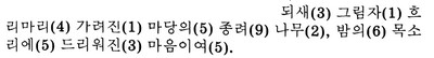[К сожалению, в переводе не удалось сохранить картину, соответствующие тем цифрам, которые есть в корейском тексте, где первая буква каждого слова в стихотворении обозначает какую-нибудь цифру.