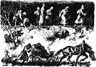 …А на Кубань пришла весна, чаще выглядывало солнышко, снег начал быстро таять. Кубанский чернозём превратился в непролазную жижу. Кони брели в ней по колено, еле волоча повозки, увязавшие в грязи. Когда в Екатеринодаре переправились по железнодорожному мосту через Кубань, стало ещё труднее. Вся отступавшая армия втиснулась в две узкие линии, железную дорогу и просёлок, тесно жавшиеся друг к другу. По полотну железной дороги шли пешие. Люди, выбившись из сил, — а среди них было много тифозных — валились в грязь на откос насыпи. Другие шли мимо, стараясь на них не смотреть. По просёлку двигались всадники и подводы. Ослабевшие кони падали на дороге, тонули в жидкой грязи. Их бросали или из жалости пристреливали, повозку тоже приходилось бросать. Чем дальше уходили, тем все больше оставалось позади брошенных лошадей и повозок, а на насыпи умерших или умиравших людей. Вадимке было страшно. Чтобы не упали его Гнедой и Резвый, он в станицах во время ночлега старался не только добыть для них корму, но и отдавал им почти весь свой хлеб, который ему иногда выдавали.