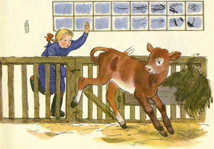 Малышка долго глядел на эти белые горки, удивлялся. «Вот так молоко! Не течёт, а сыплется, точно опилки какие-нибудь. Оно, наверное, сладкое да тёплое», — подумал телёнок и облизнул губы. Ему захотелось выйти на волю, погулять. Но где там — клетка мешает.