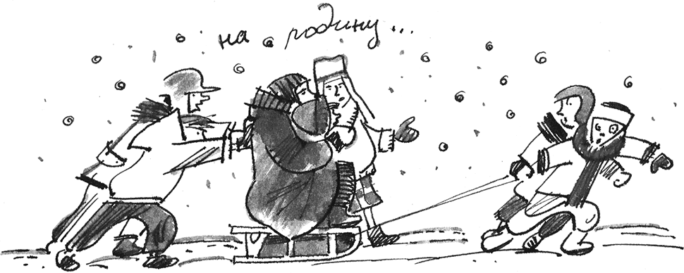 Как какая-нибудь северо-южная королева, сидела она на мягком одеяле, в зимнем пальто прямо посреди поляны нарисованных ромашек. Больших трудов ей стоило удерживать спину прямо, все же одеяло – мягкая и зыбкая вещь, и если оно не лежит на кровати, то сидеть на нем неудобно, поэтому скоро она подозвала Глеба. Он встал позади, и мама привалилась к нему спиной, а мне пришлось заменить брата и тоже нести маму. Я взяла одеяло за угол, обмотала вокруг запястья, чтобы не выскользнуло. Передний край поляны тащил Васька со своим вечным Денькой. Мы с Димкой были сзади, Глеб тоже, но он поднимал двумя руками середину так высоко, чтобы одеяло было похоже на сиденье кресла. Мы прошли так двадцать один или двадцать два шага и уронили маму. Хорошо, что она не очень большая и не очень толстая, а то уронили бы раньше. Пришлось Глебу бежать домой за санками, не понимаю, почему сразу мы до этого не додумались. Теперь дело пошло быстрее. Сашка даже начал отставать от нас, но мама взяла его на руки, и мы снова замедлились. То Глеб, то Димка, то Васька с Денькой катили санки. Я шла рядом.