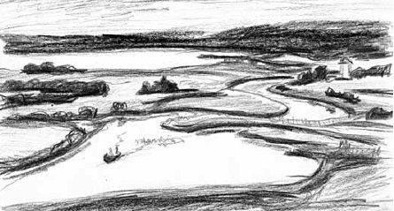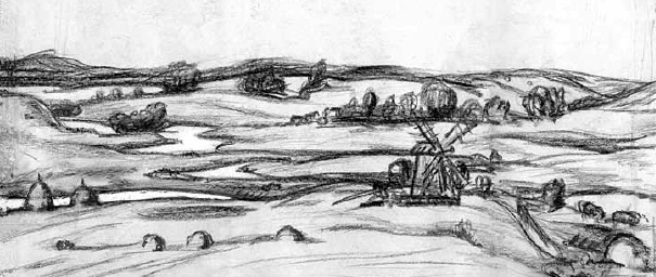 Пошли на Савкину горку, там стоят каменный крест и часовенка, посвященная гибели монастыря, который был как раз в Воронине, который раньше, оказывается, был городом. Его разрушил польский король Стефан Баторий (вот сволочь!) во время похода на Псков. Оттуда мимо мельницы и оз. Маленец по Сороти прошли в Михайловское и увидели страшную картину поругания. Везде таблички с обращениями к паломникам, мраморные доски со стихами под каждой ёлкой и всякие разные другие противные таблички. Перешли через Сороть по пешеходному мостику. Побывали в деревнях Зимари и Дедовичи. Оттягивались на Савкиной горке и под Дедовичами. Искали сюжеты, но всё не то. Вокруг очень красиво, но писать бы это я не стал. Не за что зацепиться. Не хватает какого-то предмета. Может, завтра что-нибудь надыбаем.