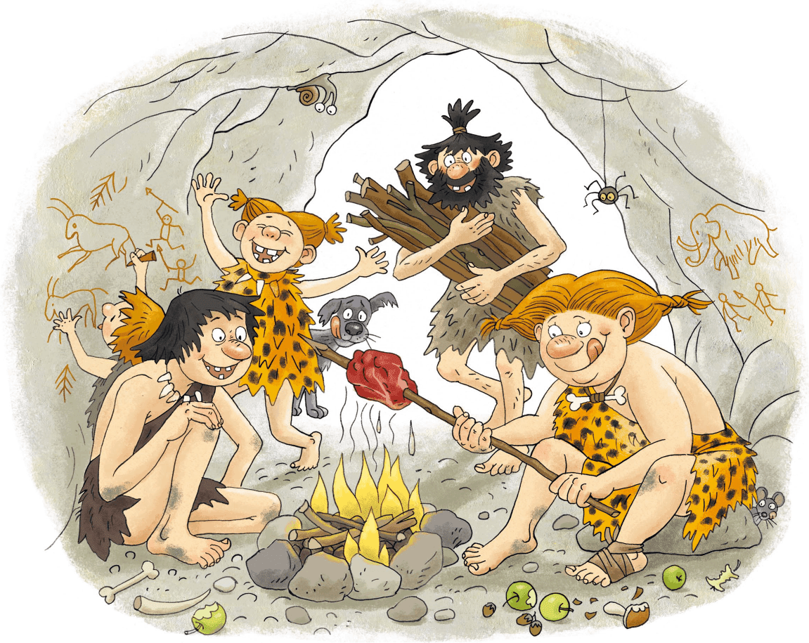 Если бы мы могли сесть в машину времени, отправиться в прошлое и заглянуть на обед к первобытному человеку, то увидели бы, что наши предки питались примерно одинаково. Они ещё не умели возделывать поля, поэтому охотились и собирали съедобные растения, которые встречались у них на пути, например орехи и дикие яблоки. А готовили эту нехитрую снедь на костре.