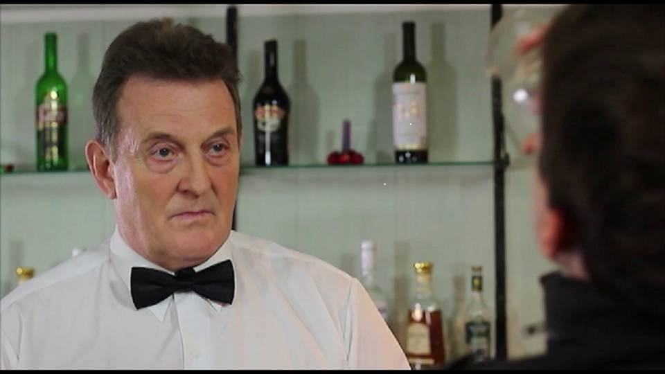 Бармен выставляет перед Харитоновым бокал и наливает в него коньяк.