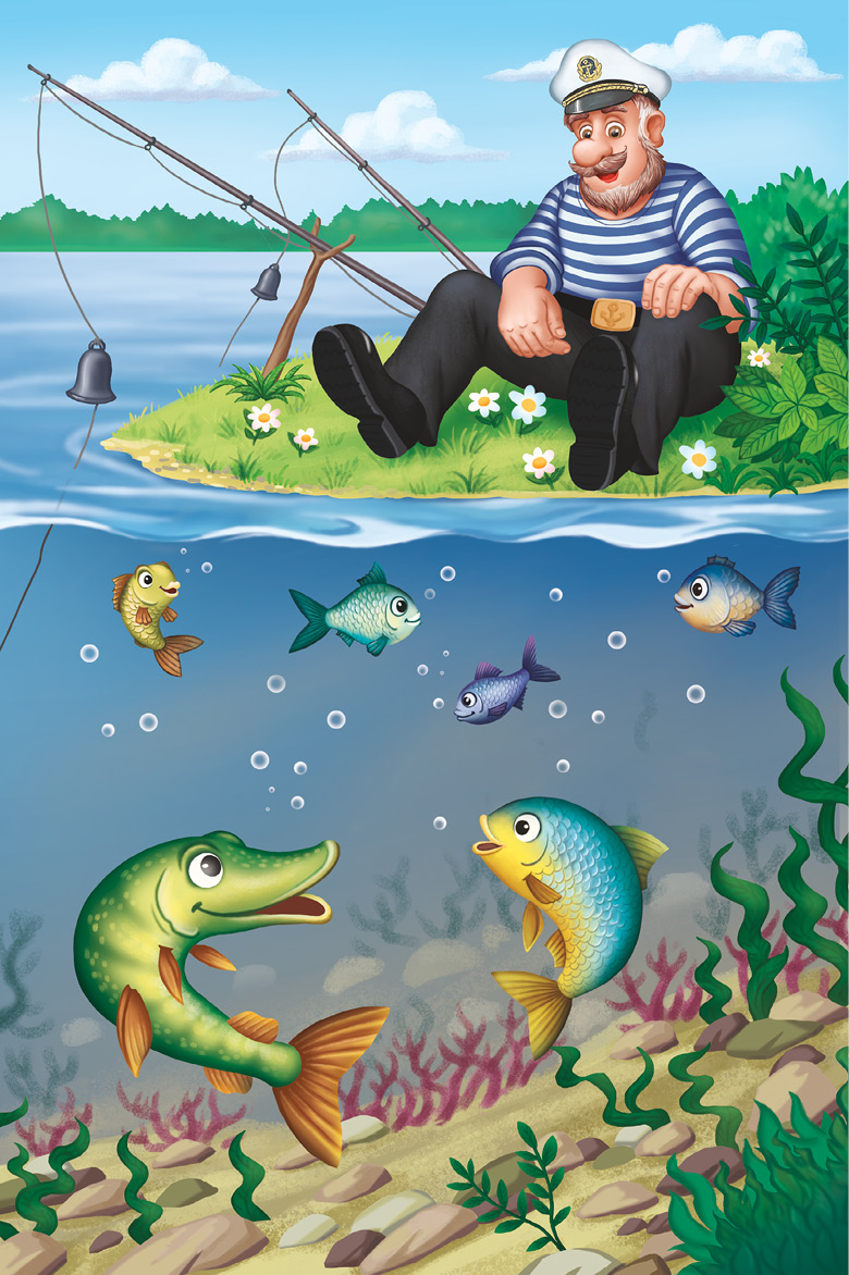 Решил боцман Сарма рыбалку устроить. Проверить, чему научились глупые молодые рыбёшки, которых он учил оберегаться от разных уловок браконьера Шито-крыто. Будет ли рыба клевать на червяка. На донную удочку.