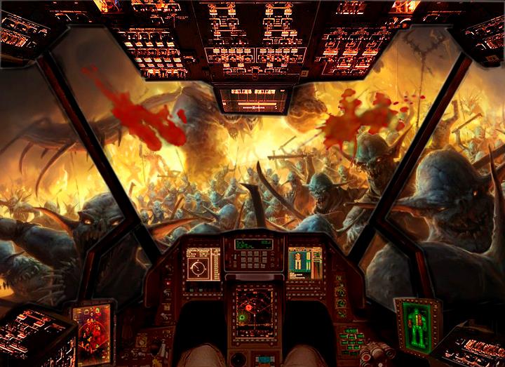 После этих двух я перестал отмечать особенности своих жертв- некогда было. У кого-то было много щупалец, у кого-то пасти на всем теле и так далее. Я сосредоточился на счетчике боеприпасов и экране целостности брони, поскольку нет нет, да и получал увесистую плюху от особо бронированного монстра. Толпа прибывала и начала захлестывать меня волнами. Солнце уже село, но подожженное НУРСами поле весьма неплохо горело, давая хорошую подсвету поля боя.