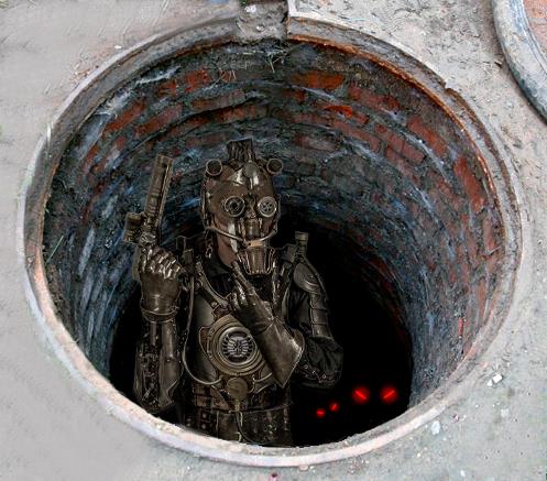 Догадку о брачующихся кротах переростках издающих странные звуки из под земли разрушил отлетевший в сторону люк ливневой канализации, что был совсем рядом с моими ногами. Нечто похожее на самовар выглянуло из открытого зева и тут же нырнуло обратно. Загремели выстрелы напополам с матами.