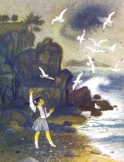Хмурым ветреным утром Лёля вышла погулять к морю, В кармашке её платья лежала горбушка хлеба для чаек. Девочка отламывала от горбушки маленькие кусочки и кидала их высоко вверх. Птицы влёт подхватывали корм и всё кружили, кружили над девочкой. Они уже знали Лёлю.