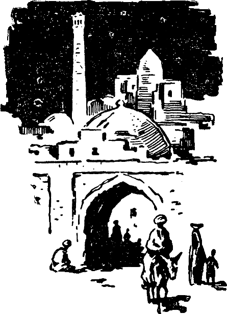 В низком ночном небе клубились черные тучи. Они полыхали огнем, тяжело гремели и порой проливались на землю крупными каплями дождя. Темные улицы Бухары были тихи и безлюдны. Только в квартале Аскар-Би, расположенном в отдаленной северо-западной части города, слышался шум. В центре улицы, над воротами большого дома, горел фонарь. На невысоком глинобитном возвышении — суфе, которое обычно занимал сторож, сидели и неторопливо разговаривали трое мужчин. Из дома доносились громкие голоса, музыка и слова песни, — хафиз пел протяжно, на манер бухарских «маврича» — выходцев из Мерва. Он пел:
