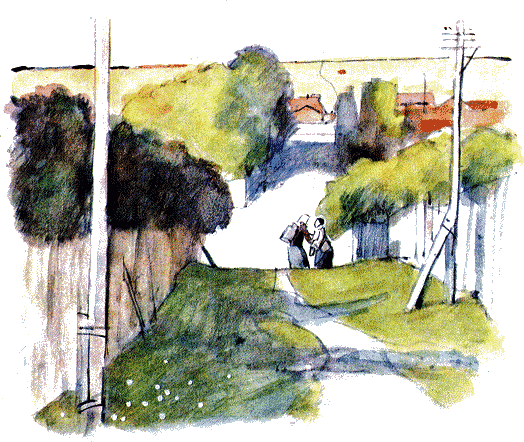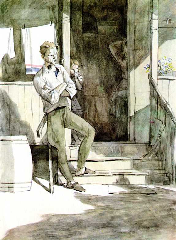 Вот сидим мы верхом на крыше. И видно нам сверху, как в соседнем саду, у крыльца, дымит трубой самовар. А на крыльце сидит хромой старик с балалайкою, и возле него толпятся ребятишки.