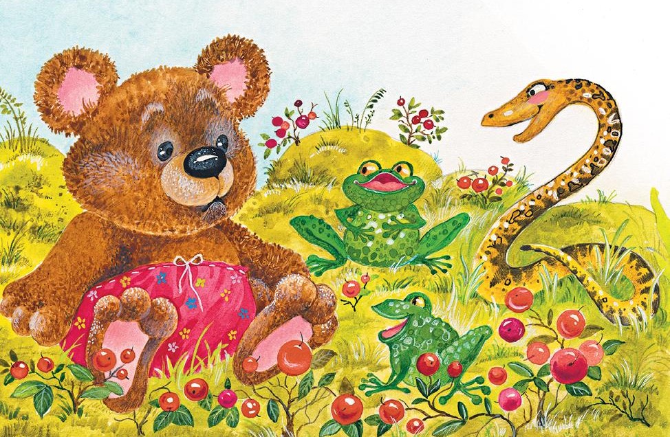 А тем временем Топтыжка оказался на краю болота. К нему сразу прискакали знакомые лягушки и приползли змеи.