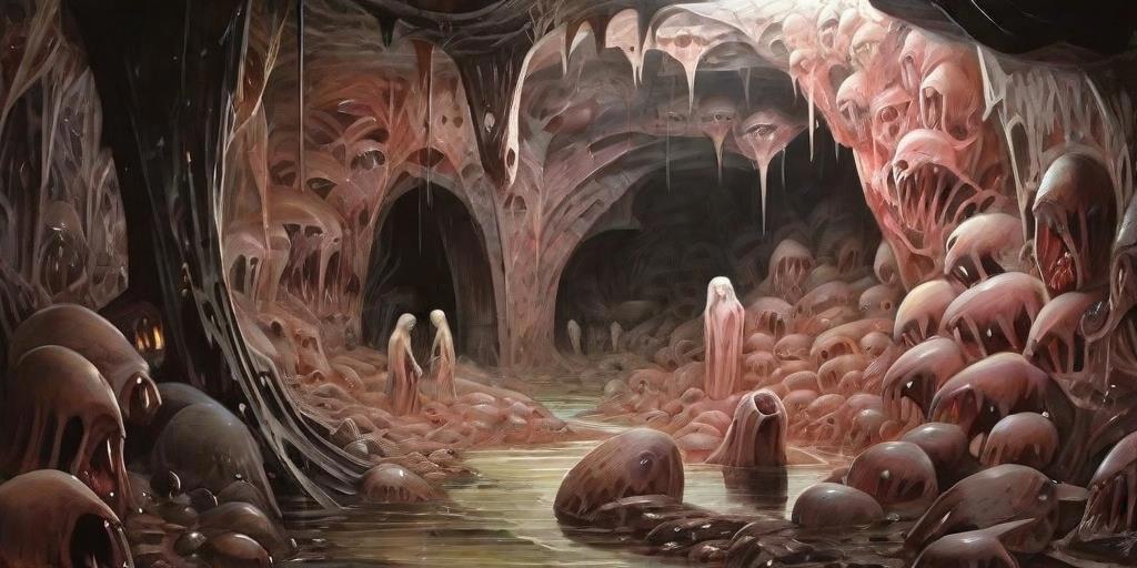 Гуманоидка понесла меня по довольно-таки жутковатому строению, наверное... ну или скорее даже пещере из плоти и костей, покрытых какой-то противной слизью...
