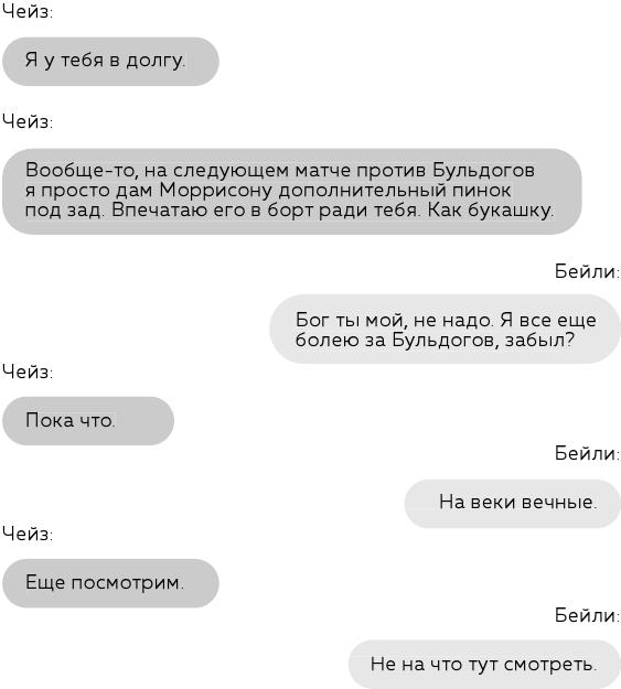 Нам надирали задницы со счетом ноль – два, так что не я один был не в форме. Тренер Миллер прошелся по нам крепким словцом и умчался прочь, хлопнув дверью раздевалки. Оставшиеся переглянулись со смесью вины и недовольства. До конца первого перерыва оставалось еще шесть минут.