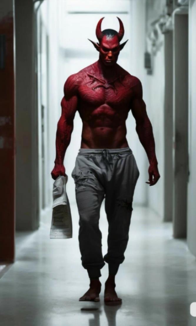 Тут одна из дверей открывается и из её выходит воир, довольно небольшой по сравнению с теми которыми мне приходилось видеть, был он одет в серые как и эти стены штаны, короткие чёрные волосы, два красных рога размером с ладонь, длинные острые уши, накачанный голый торс, шлёпанцы и… газета.