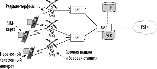 Мобильный телефон взаимодействует с сотовыми базовыми станциями через радиоинтерфейс (air interface), который мы опишем чуть позднее. Все сотовые базовые станции подключены к контроллерам базовых станций (Base Station Controller, BSC). Они управляют радиоресурсами сот и отвечают за передачу обслуживания. BSC подключаются к MSC (аналогично AMPS), который маршрутизирует звонки и соединяется с PSTN.