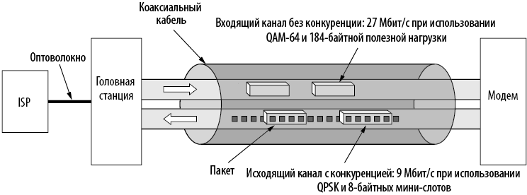 В исходящем направлении радиочастотного шума больше, чем во входящем, поскольку система изначально не была рассчитана на передачу данных. Помехи от множества абонентов направляются к головной станции, поэтому в модемной связи используются более консервативные подходы от QPSK до QAM-128, в которых часть символов используется для защиты от ошибок с помощью треллис-модуляции. Благодаря меньшему числу битов на символ в исходящем направлении асимметрия входящей и исходящей скоростей оказывается намного сильнее, чем на илл. 2.46.