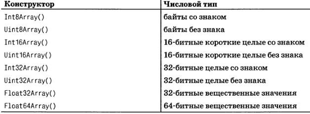 Всего существует восемь разновидностей типизированных массивов, каждый с различным типом элементов. Создавать их можно с помощью следующих конструкторов: