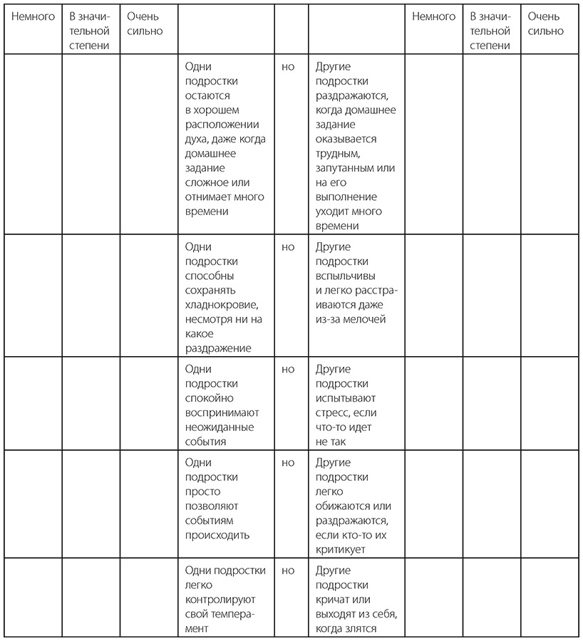 Подростковый возраст, конечно, приносит новые эмоциональные проблемы родителям и подросткам. Подростки более восприимчивы к повышенной эмоциональной напряженности и эмоциональным срывам перед лицом того, что они считают стрессом. Для этого есть как биологические причины, так и причины развития. С биологической точки зрения в результате изменений в растущем мозге подростки испытывают значительное повышение эмоциональной напряженности. В то же время развитие лобных долей отстает от изменений в других областях мозга, так что им трудно модулировать или гасить сильные эмоции, которые они испытывают. Подростки, у которых в прошлом был слабый эмоциональный контроль, подвержены еще большему эмоциональному потрясению, чем их сверстники. И если ваш подросток входит в их число, вы, вероятно, можете ожидать более ожесточенных столкновений, когда у вас возникнут разногласия во мнениях или вы попытаетесь исправить поведение вашего подростка. Воспользуйтесь анкетой из этого раздела, чтобы более подробно изучить навыки подростка в области эмоциональной регуляции.