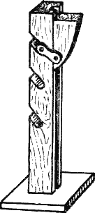 При остружке кромок досок значительной длины, зажимаемых поперечным винтом, во избежание провисания противоположного конца доски применяется особая подставка с уступами, с подвижной колодкой (рис. 106), подвешиваемой на нужном уступе при помощи железного хомутика.