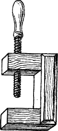Если распиливают доску, положив ее плашмя на верстачную доску и держа лезвие пилы вертикально, то доску прижимают к верстачной доске при помощи струбцинок (рис. 107), которые служат и для взаимного прижимания склеиваемых частей.