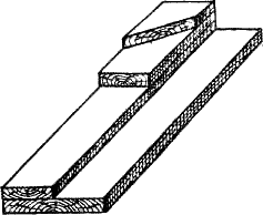 При необходимости застружки торцевых концов досок под углом прямым или в 45° к долевому направлению доски применяется стусло (рис. 108), склеенное из досок твердых пород. Стусло зажимается между клинками верстака, к уступу прижимается боковою гранью доска, а торец ее чуть свешивается вправо и простругивается рубанком или