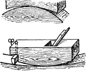 Калевка (рис. 114) имеет колодку, подобную зензубелю, во нижнее очертание ее бывает разнообразным, сообразно рисунку железки. Употребляется для отборки карниза, кромок озонных горбылей, дверных обвязок и т. п. уступов, а своей колодкой калевка скользит по краю простругиваемой доски или бруска.