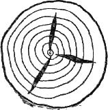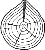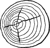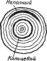 Метик (рис. 25) – радиальные трещины внутри дерева, образовавшиеся от его раскачивания и незаметные снаружи. Чаще встречается у старых деревьев и идет на значительную длину. В распиловку такие бревна не годятся, особенно если трещины идут от центра под углом (метик несогласный).