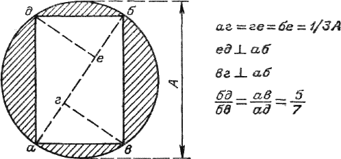 Для расчерчивания бревна на такой брус поступают как показано на рис. 40. Уложив на подкладке бревно горизонтально, по отвесу на торцевой стороне отмечают вертикальный диаметр аб, который делят на три равные части: бе, ее и аг. Из точек г и е восстанавливают по угольнику перпендикуляры к диаметру аб, один – вправо вг и другой – влево де. Точки пересечения этих перпендикуляров с окружностью торца д и в соединяют с концами диаметра а и б. Получится прямоугольник, у которого длина сторон дб и ав будет относиться к длине сторон ад и бв, как 5:7.