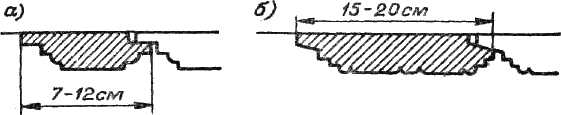Кроме указанного сортамента леса, получаемого путем распиловки, имеются еще сорта, получаемые раскалыванием кругляшей (гонт) и стружкой досок (дрань). Гонт шведский (рис. 41) получается путем раскалывания по радиусам коротких обрубков, длиною от 50 до 75 см, толщина гонтии от 5 до 15 мм, ширина – от 100 до 180 мм. Гонт польский, или шунтованный (рис. 41,б), отличается тем, что на широкой стороне дощечки проделывается паз, в который вставляется узкий край другой дощечки.