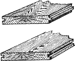 Следует упомянуть еще об одном материале, который все больше входит в практику строительства, – это многослойная фанера – широкая (до 1,5 мм), длинная стружка толщиной от 1 до 5 мм, снятая в виде ленты с окружности вращающегося вокруг своей оси кряжа. Раньше такая фанера дорогих сортов дерева шла на оклейку главным образом мебели. Теперь склеивают несколько слоев такой фанеры из более дешевых сортов леса (ольха, липа, береза и т. п.), располагая волокна во взаимно перпендикулярном направлении, и получают многослойную фанеру, пригодную для заполнения дверных полотен, устройства переборок, подшивки потолков и т. п.