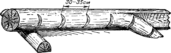 Сделав то же построение на другом торце бруса, но с соблюдением размеров, полученных на тонком торце (иначе получится брус, уширяющийся к одному концу), отбивают вдоль бревна шнуром черты по точкам а – д – б – в, поворачивают бревно так, чтобы будущие две грани были вертикальны, как показано на чертеже, закрепляют бревно и начинают отеску.