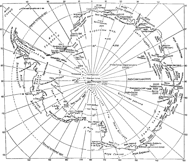 Сейчас после Международного геофизического года континент исследован довольно хорошо, уже не просто перечислить все открытые и получившие названия области. Сделаем только краткий обзор их. Обойдем континент от нулевого меридиана по часовой стрелке. В названиях отображена история открытия и исследования Антарктиды. Имена почти всех отважных исследователей запечатлены на карте Антарктиды (рис. 6).