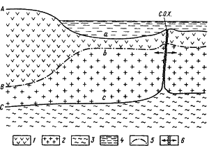 1—земная кора; 2 – литосферная плита; 3 – астеносфера; 4 – океан; 5– граница Мохо; 6 – граница раздвижения плит. С. О. X. – срединный океанический хребет